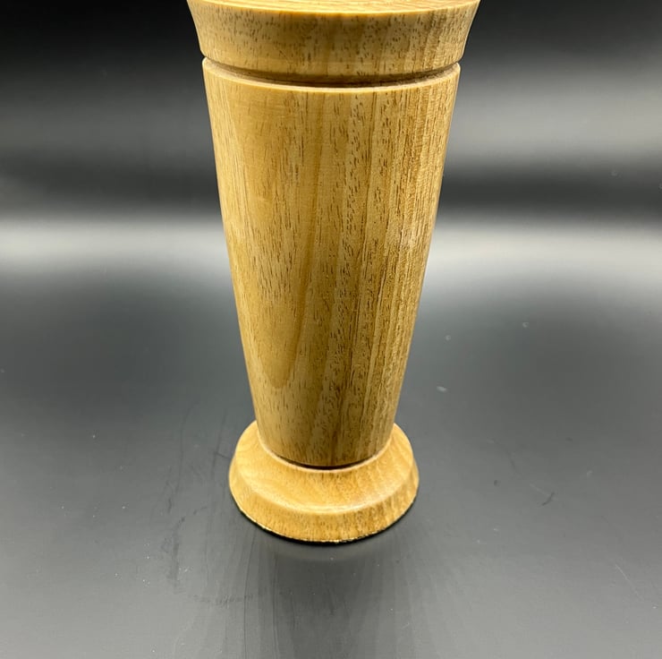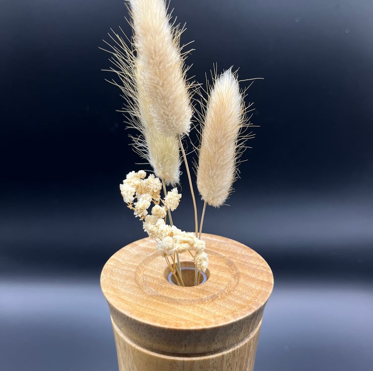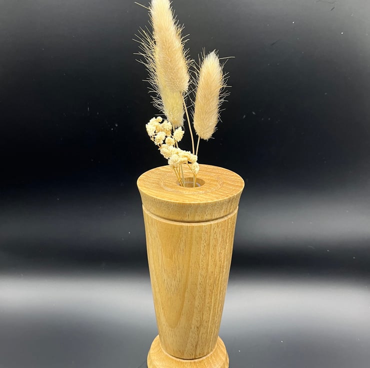 Handmade bud vase in Lime wood. Finished with detail grooves in the side and top. There is a small tube inserted so can hold water for live buds, or be used for driedartificial ones.