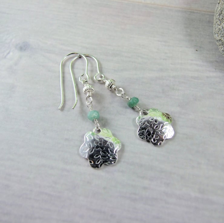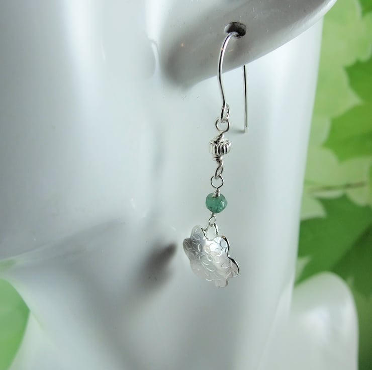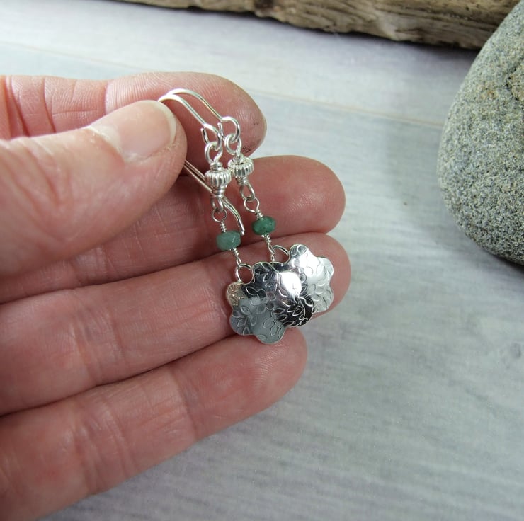 I first created the small flower shape shape by texturing silver sheet then cutting out the small flower and soldering on a small hoop to hang. I then wire wrapped 3mm faceted emerald gemstone beads and some sterling silver beads all securely joined to the dropper and fitted to .925 sterling silver ear hooks.