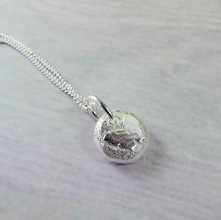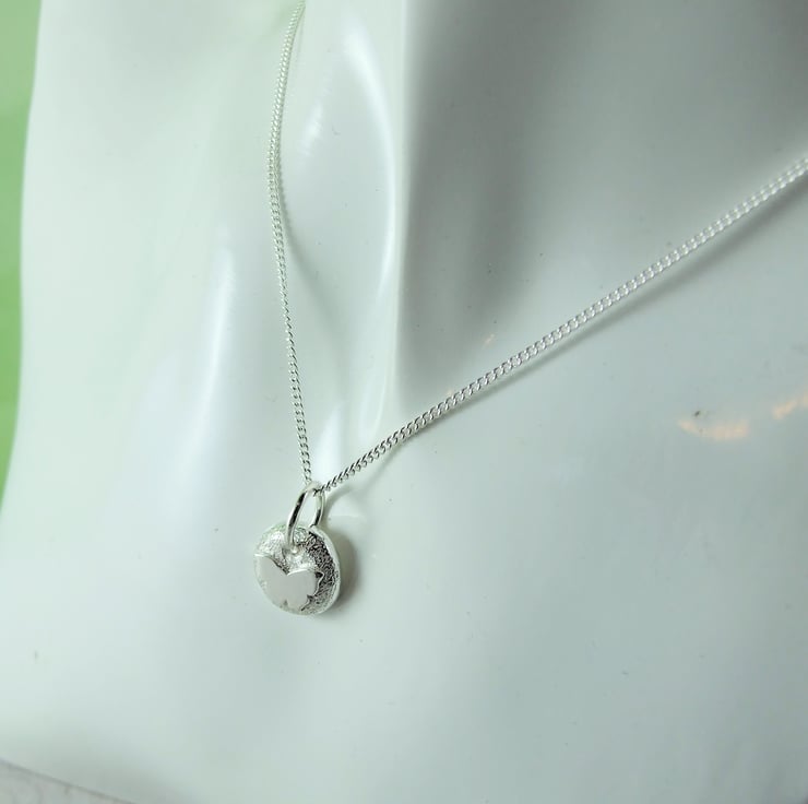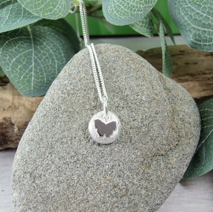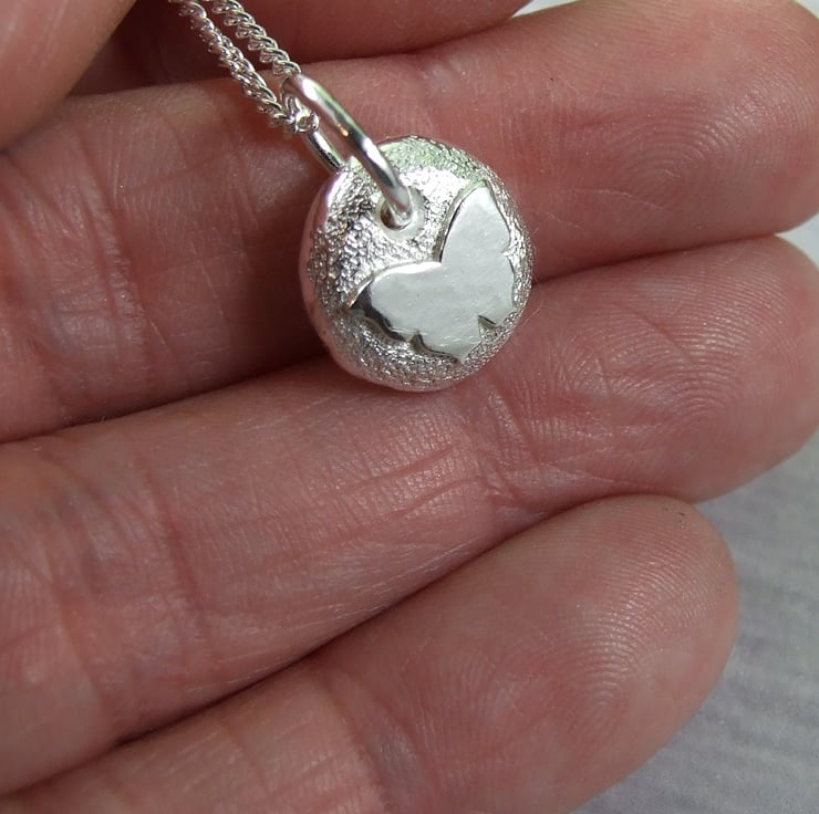 I have created the silver nugget from recycled silver heated to melting point when it forms a natural pebble shape, then once cooled slightly flattened on the top and added the loop to hang. I then soldered on a small butterfly. I created the texture on the pebble with handtools to give a sparkly finish. Fitted to an 18 inch sterling silver chain.