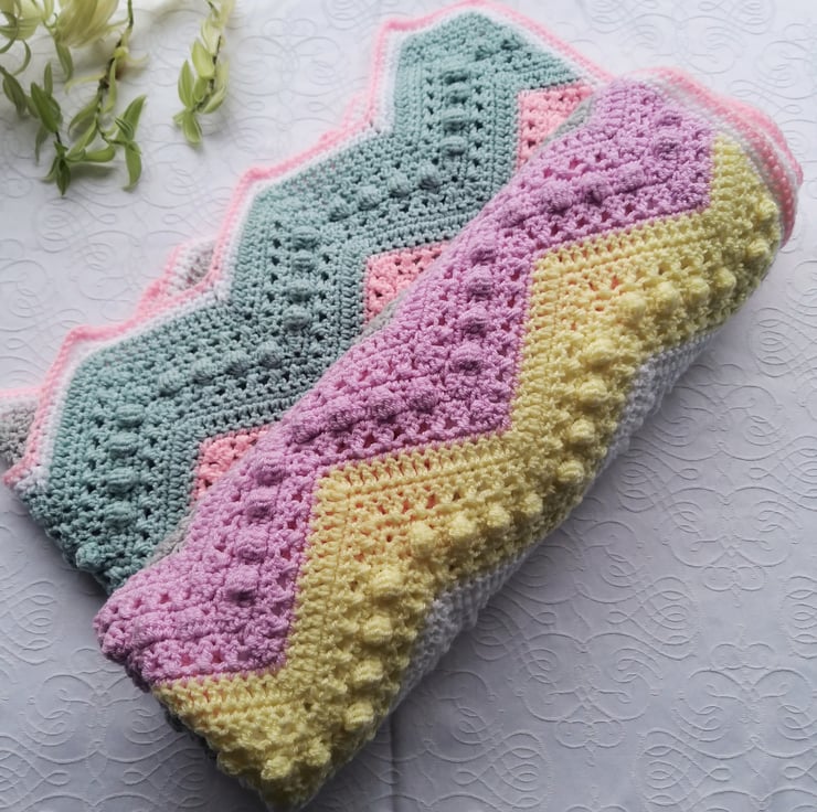 This baby blanket is crochet in gorgeous colours including lilac, candyfloss, lemon, duck egg, silver and white. In a zig zag pattern it has cute bobbles and dainty 'kisses' in it's pattern to give a nice texture.
