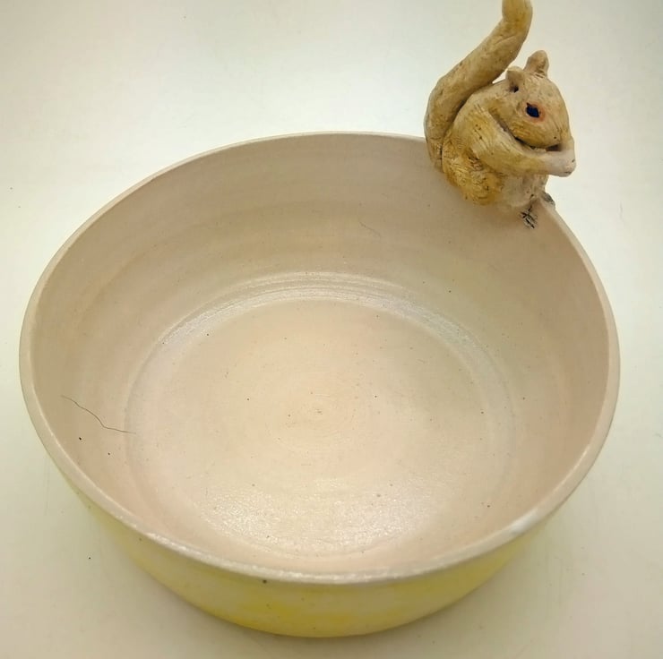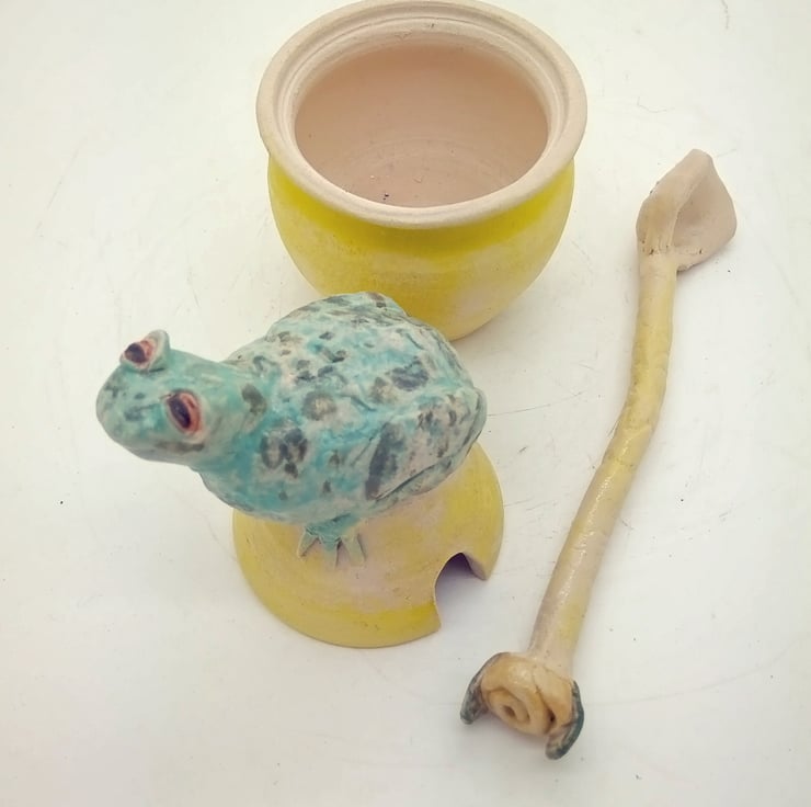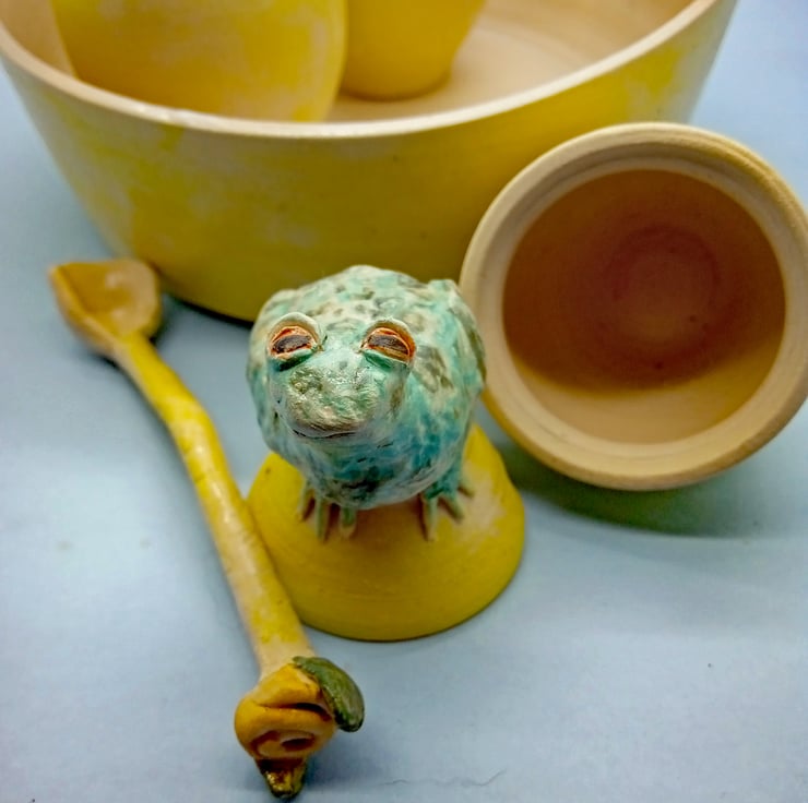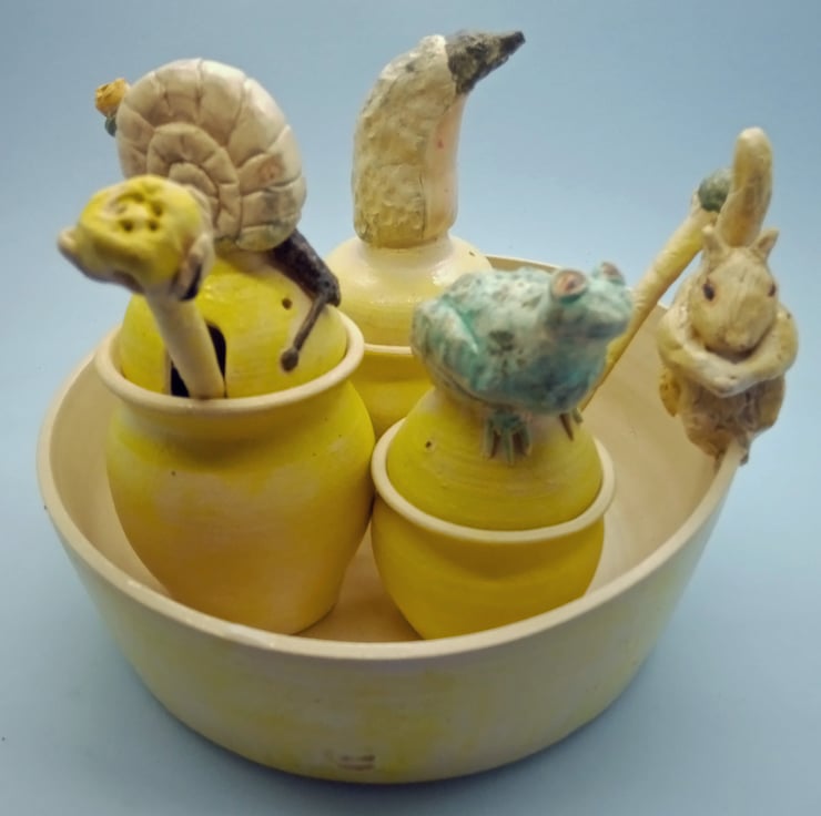 Thrown on the wheel with hand formed additions of different animals. Sprayed with yellow slip, once leatherhard. High fired to stoneware to suitable for use with food ie milk/sugar/drinking vessel approx 19 & 16 cms.