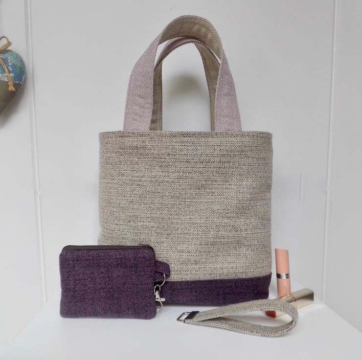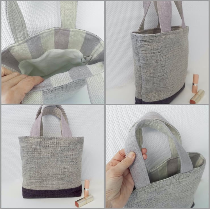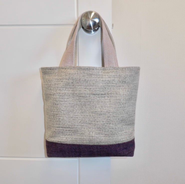 The base is a plain rich purple with a woollen texture and is boxed to make it easier to find things inside! The handles mauve, the same fabric as the facing, and the loop of each handle measures about 36cm.
