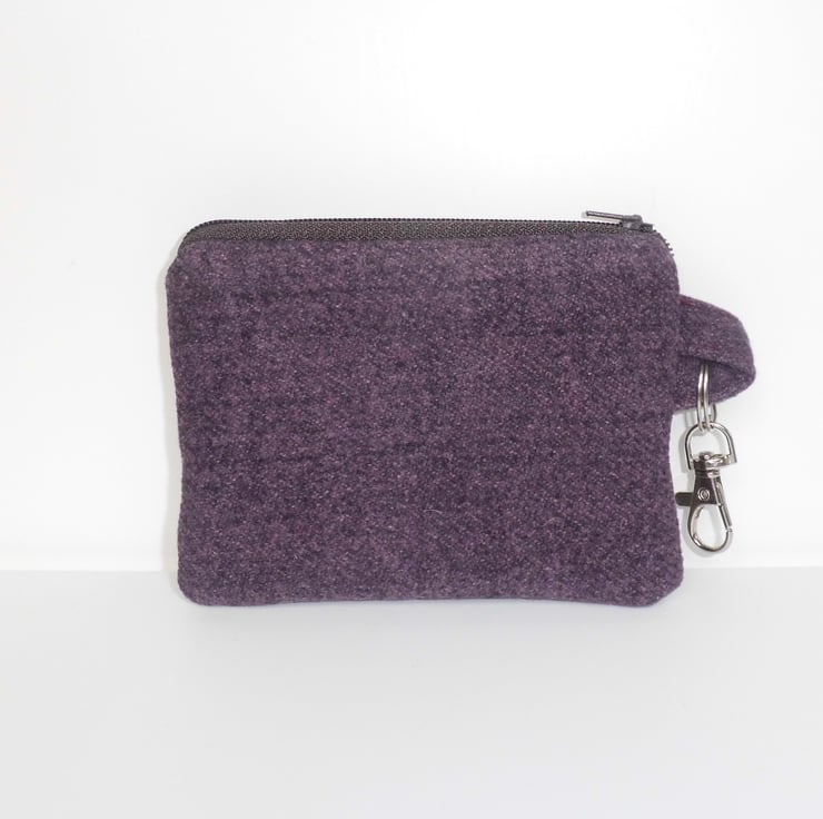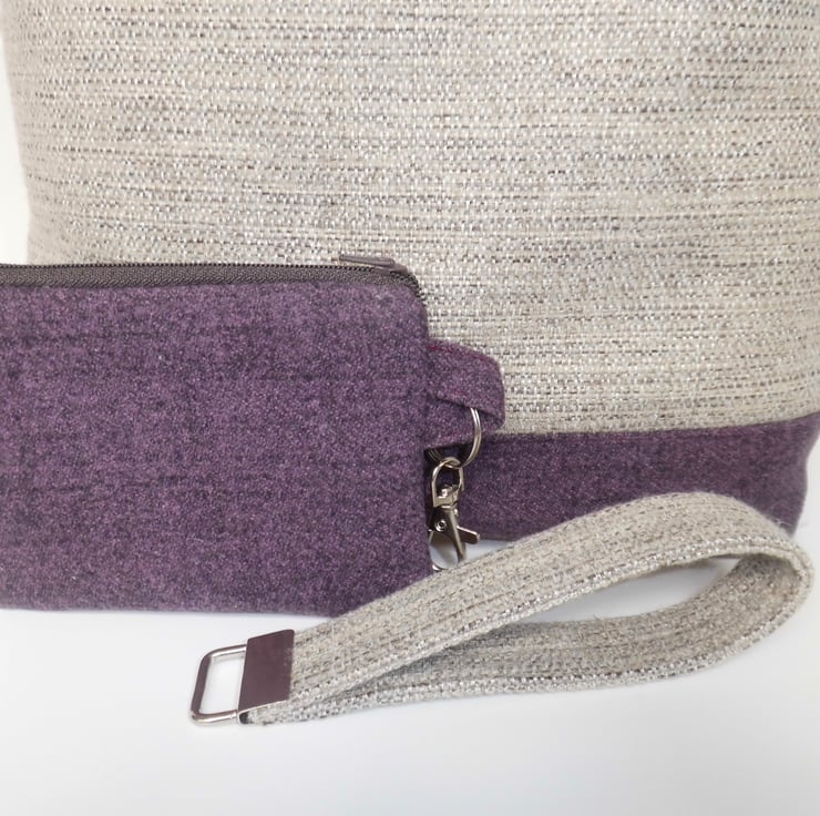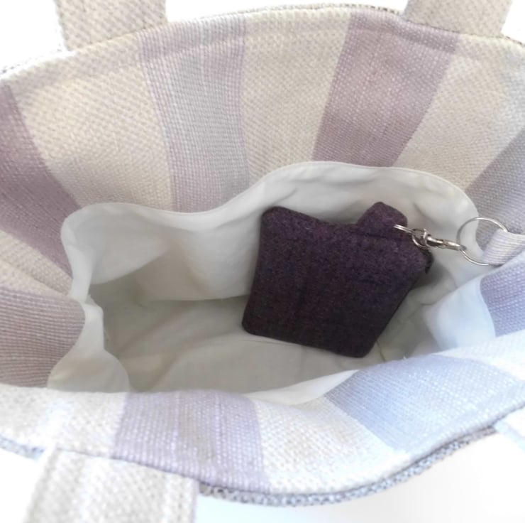 Also included is purse which matches the base of the bag, for coins or some make up essentials. It measures about 15cm x 9cm and is lined with the same cotton as the tote. Interlined with a layer of felt for added squashiness. There is a dark aubergine zip across the top and I have inserted a key ring into the side seam, complete with a lobster clasp so that this purse could be clipped safely inside the tote.