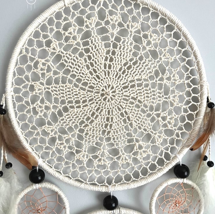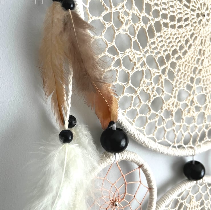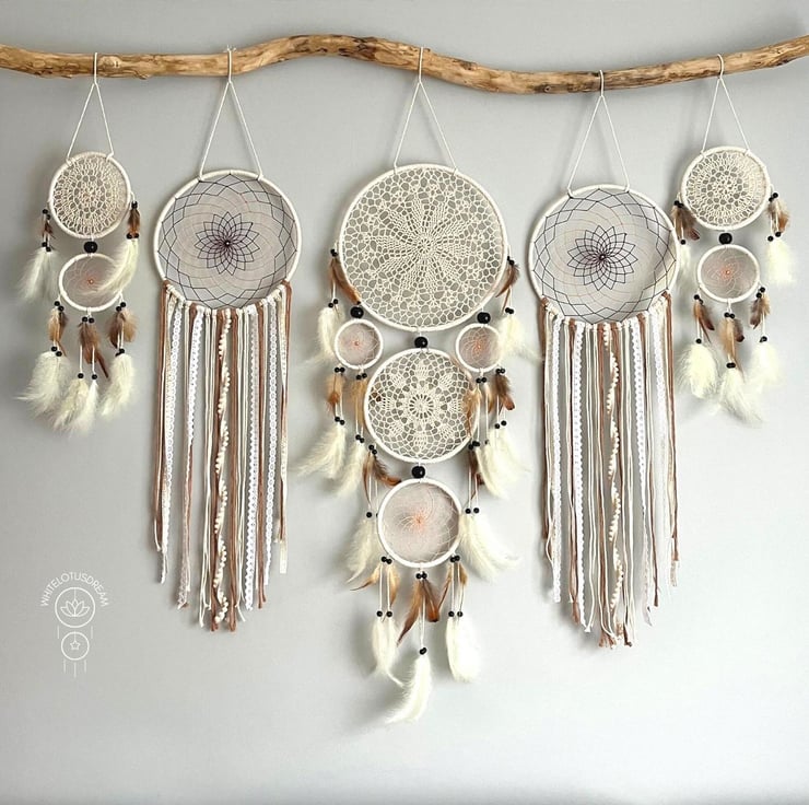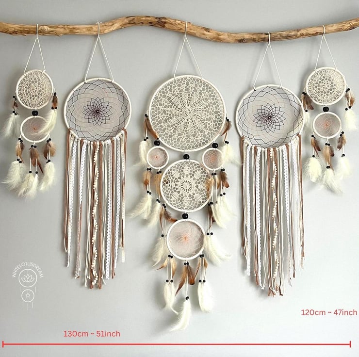 This is our 5 piece dreamcatcher set in the colour coffee and cream with orangy brown feather details. All of our dreamcatchers are meticulously and carefully made. A splendid choice of wall art decor that would look lovely in your bedroom, living room, meditation room, or as a unique gift for someone special. If you would like your dreamcatcher to be customised and designed by you then please message us and we will be happy to make your dream come true!
