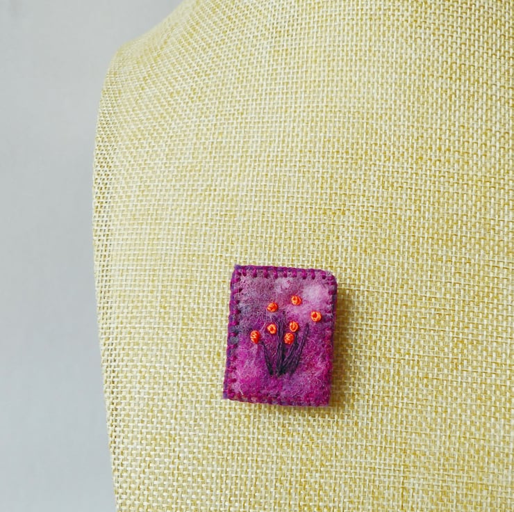Needle felted and hand embroidered brooch in purple with orange flowers