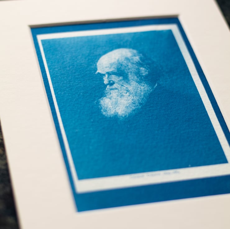 This is an original cyanotype of an illustration of the English Naturalist Charles Darwin.
