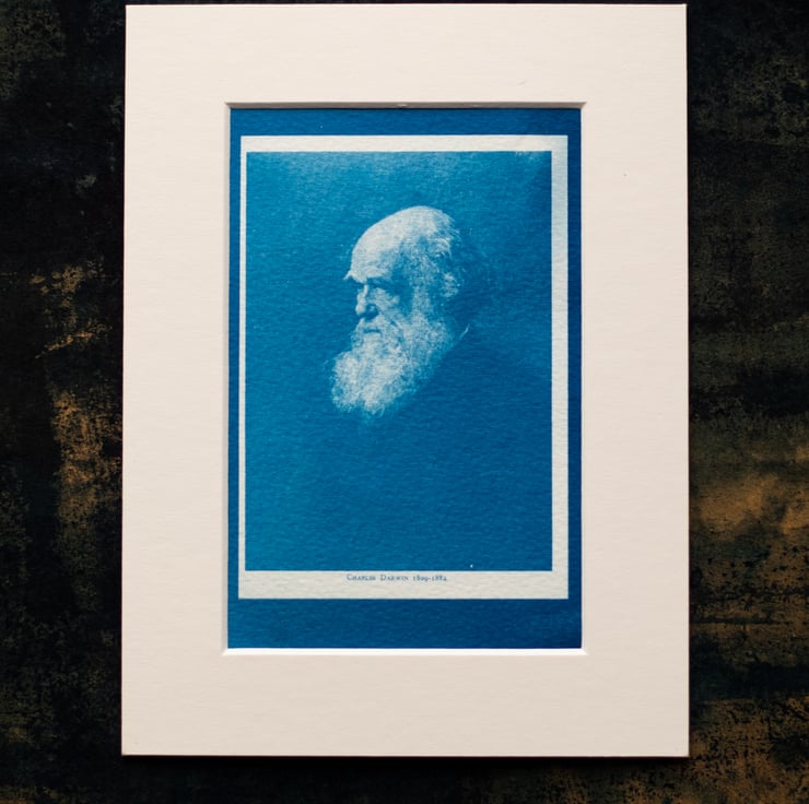 I have a love of natural history and as a photographer and artist, books are a huge inspiration for me. Vintage books especially so. The book this image was taken from was published in 1946 and is crammed full of beautiful illustrations. Cyanotype is a Victorian process so using an image of someone that lived during that era and reproducing it in this way works so well and I hope you think he looks just as amazing as I do! Charles Darwin was born in my home town of Shrewsbury in 1809 and went on to change the way in which we understand the natural world through his theory of evolution.