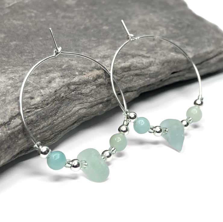 Gorgeous sea glass hoop earrings, handmade from genuine aqua green Scottish beach glass, frosted Amazonite crystals and sterling silver beads. These sterling silver beaded hoops each have a beautiful nugget of sea glass, worn smooth and frosted in the Scottish sea. This pale green colour is evocatively known as 'sea foam'.