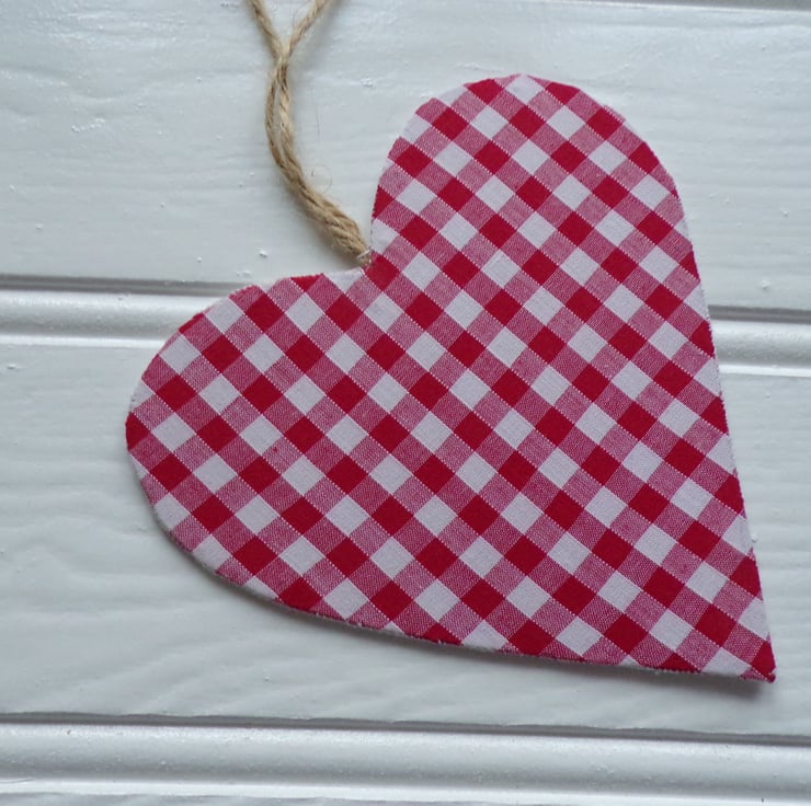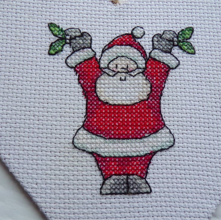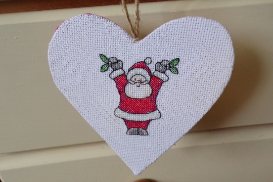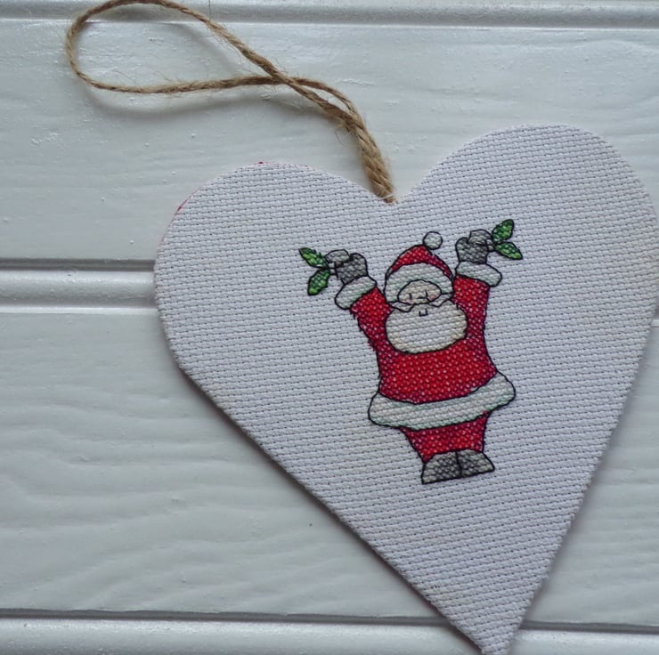 Christmas Decoration, Christmas Heart, Father Christmas Decoration, heart wall hanging, heart decoration measuring approx. 13x13cm. Father Christmas stitched on to white aida, backed in a red gingham fabric and a twine hanger. The heart has a card inner to make it sturdy. It looks really pretty hanging on a wall, Christmas tree, wardrobe handle, cupboard handle on a door or to use as a decoration on a gift to your loved one, the choice is yours.