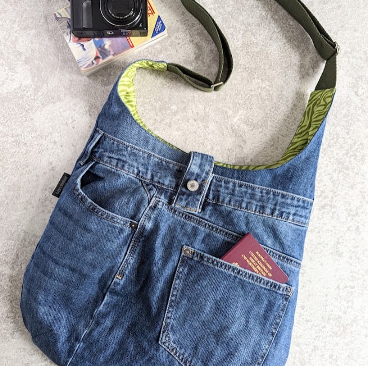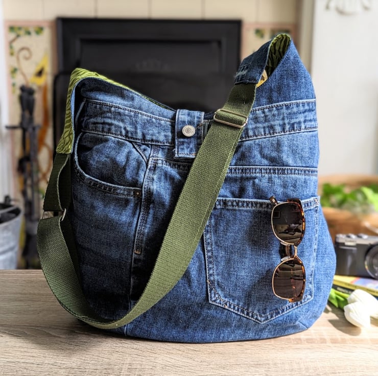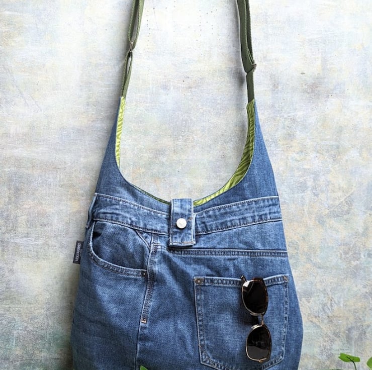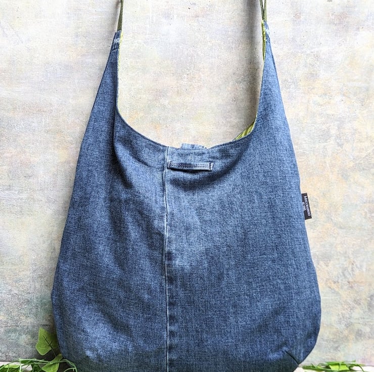 A large bag which can be used as a shoulder bag or extend the strap to go cross-body!! This recycled denim shoulder hobo bag has been handmade by upcycling a pair of pre-loved denim jeans. It’s large and roomy, slouchy and generous - perfect for all your everyday essentials and more!