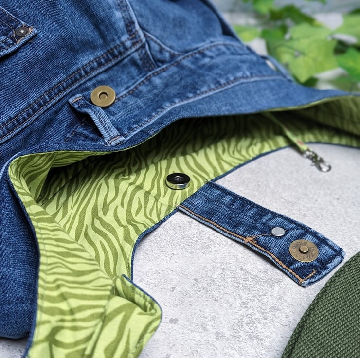 It’s lined with a green zebra print cotton poplin. The adjustable strap has been made from 38mm wide olive green green webbing .