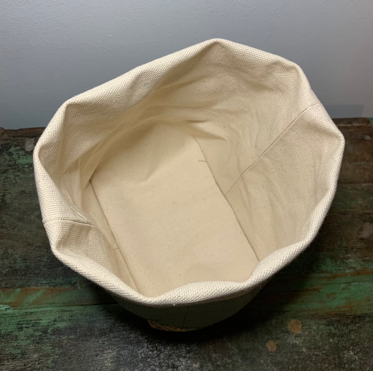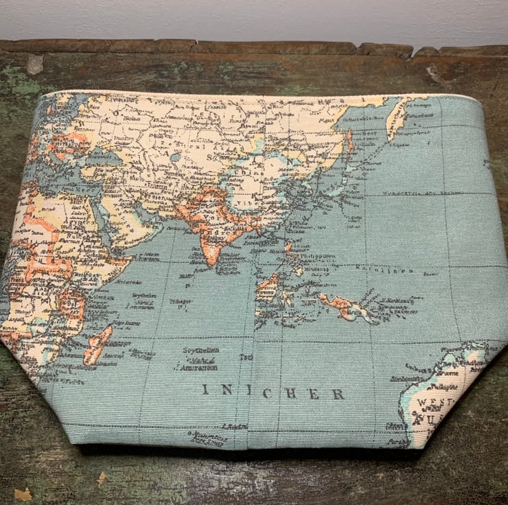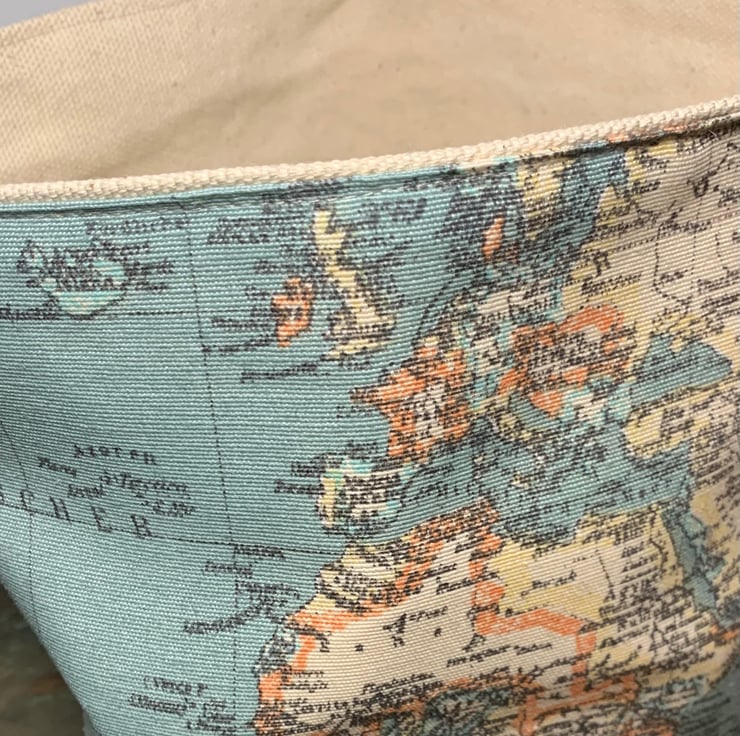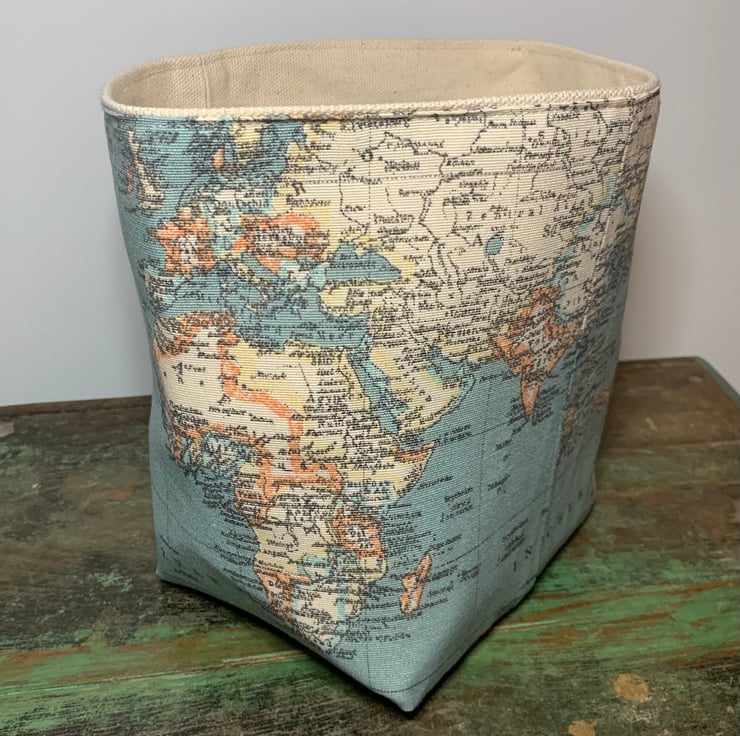 Reversible fabric storage basket made from map print cotton and thick cream cotton canvas. Can be used with a turn-down to make the most of the contrasting fabrics.