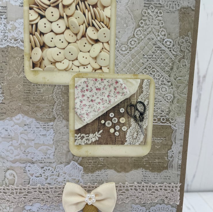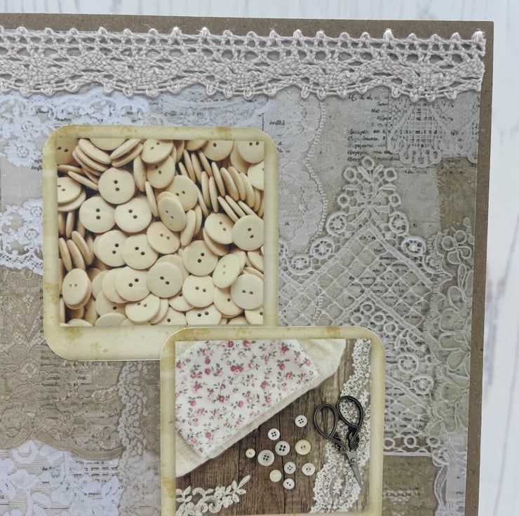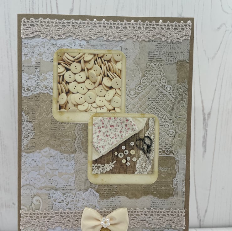 5” x 7” Kraft card with a collage lace background. Lace trim to the top and bottom of the card, satin bow with pearl centre and a thimble charm. The photos are of delightful vintage sewing bits and pieces. A single cream sheet of paper, left blank for your own inner message.