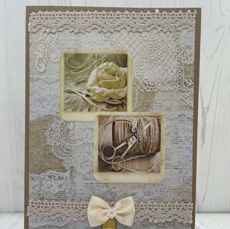 5” x 7” Kraft card with a collage lace background. Lace trim to the top and bottom of the card, satin bow with pearl centre and a thimble charm. The photos are of delightful vintage sewing bits and pieces. A single cream sheet of paper, left blank for your own inner message.