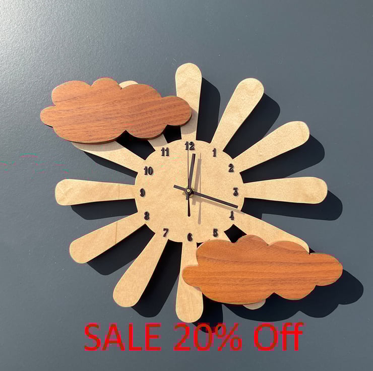 This clock looks good in any room in the house from a child's bedroom to the kitchen and make a great gift for any occasion. The clock is made from finest birch wood ply, the contrasting clouds made from walnut, the clock being coated in hardwearing satin lacquer.