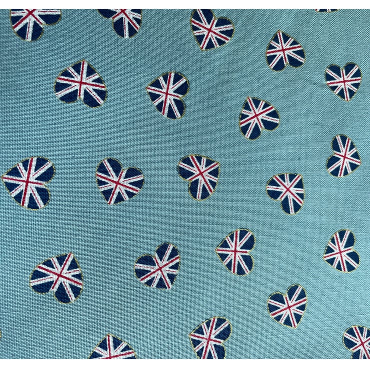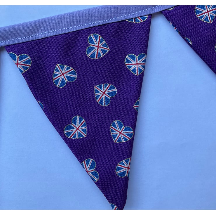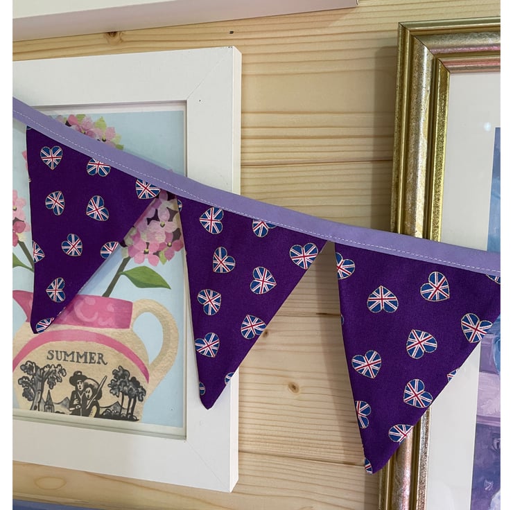 This lovely bunting is made from a pretty fabric featuring the characteristic British Union Jack design in a heart shape on a purple background.