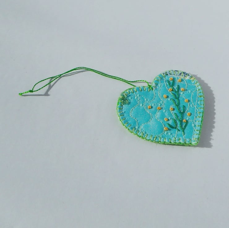 Handstitched and embroidered mixed textile hanging ornament, hanging decoration.