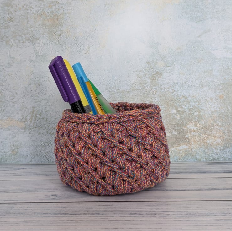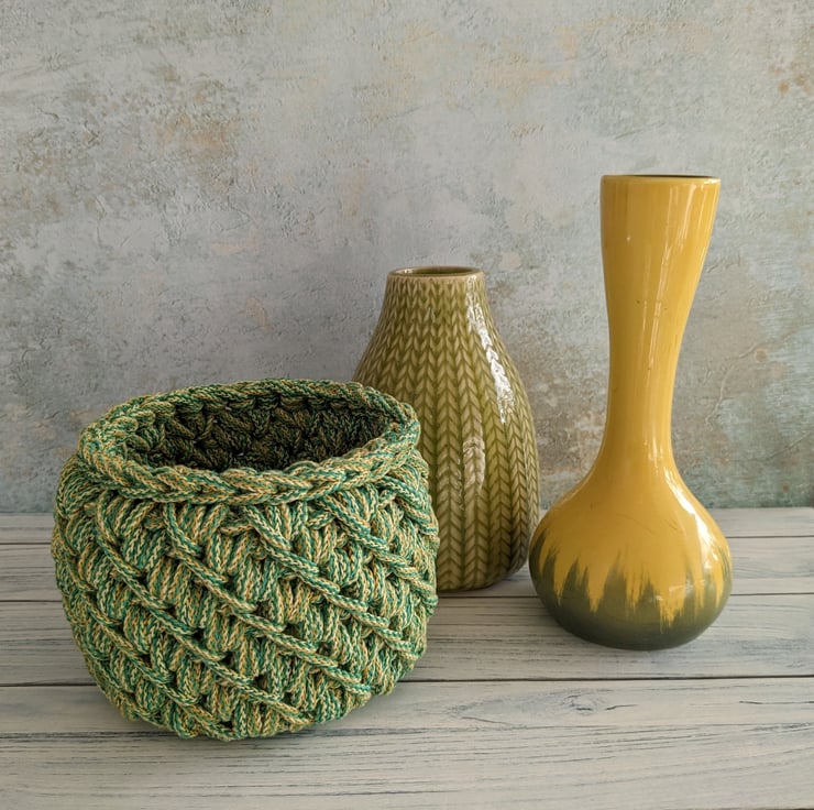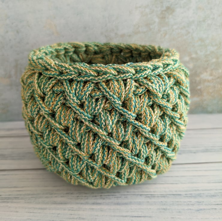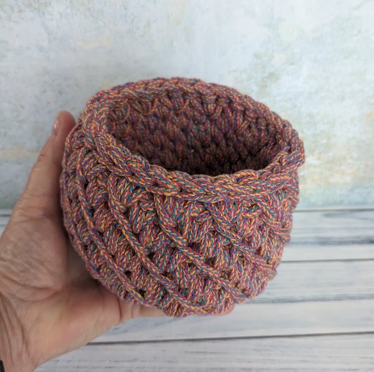 The bowl is sturdy yet flexible and keeps its shape well. The decorative slanted stitch gives the bowl a lovely woven type texture on the gently rounded sides. The top edge is finished off with slip stitch that gives strength and also provides a contrasting texture.