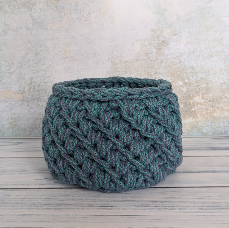 A useful small round crocheted bowl, made from a recycled cotton braided cord. Currently available in a choice of two colours, Chameleon (teal and purple mix) and Folk (red, yellow and blue mix), (Spring - green and yellow mix, is out of stock at my supplier).