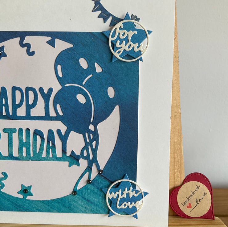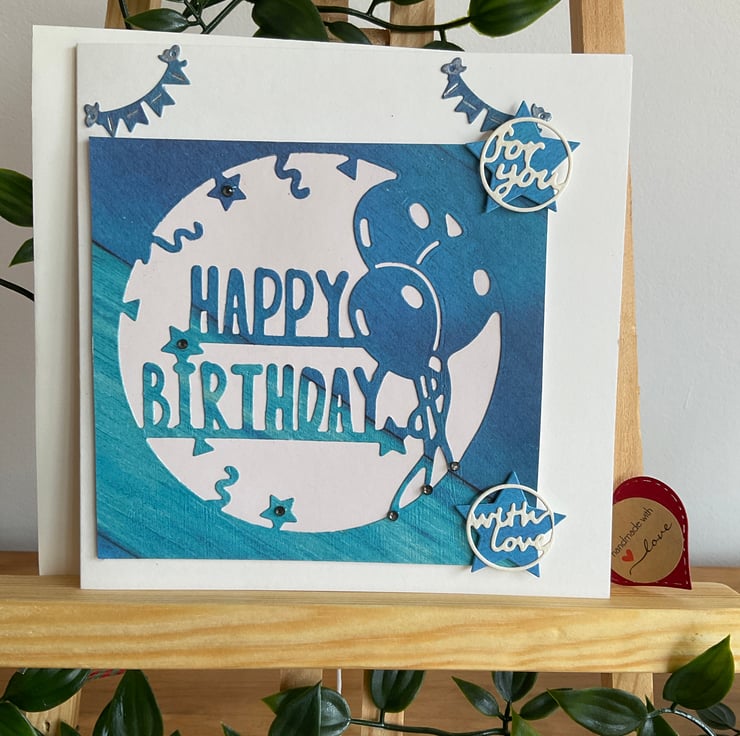 A shades of blue card featuring a cut out of balloons and the words Happy Birthday. The card is embellished with star cut outs with the wording ‘for you with love’ and is further decorated with gems. The card measures 15 x15 cms, comes with an ivory envelope and has been left blank for your own greeting.