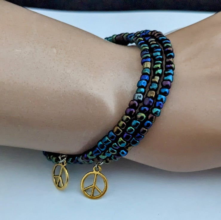 Handmade 3 coil memory wire wrap bracelet of iris lustre seed beads in stunning iridescent shades of blues and purples, with a 12mm gold tone peace sign charm at each end. In an organza gift bag.
