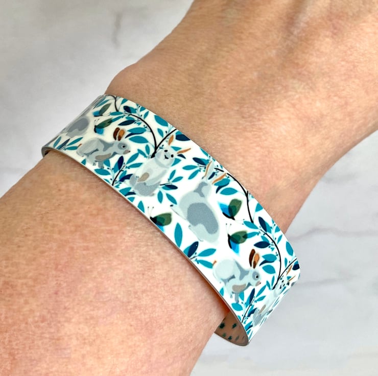 Handmade cuff bracelet with a pretty rabbit design. It has a white background with grey rabbits or bunnies, and teal green foliage. Handcrafted jewellery, made by myself in Northumberland. Ideal gift for a rabbit and pet lover. This bracelet can also be persononalised on the reverse for a small extra charge (Optional)