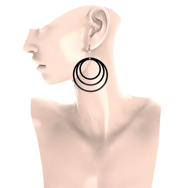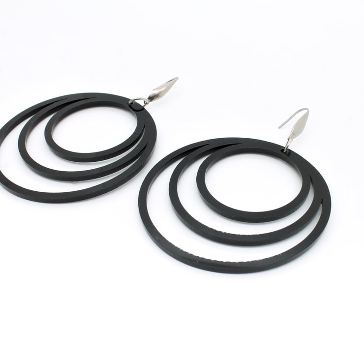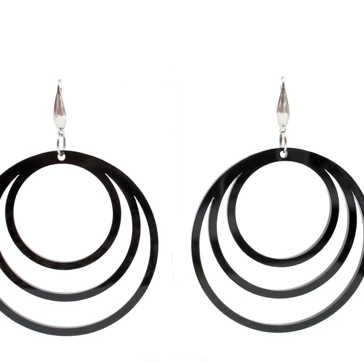 Statement black hoop earrings in a gloss black acrylic finish.surgical grade stainless steel ear hooks. Size (approx) 65 mm diameter. Lightweight and comfortable to wear.