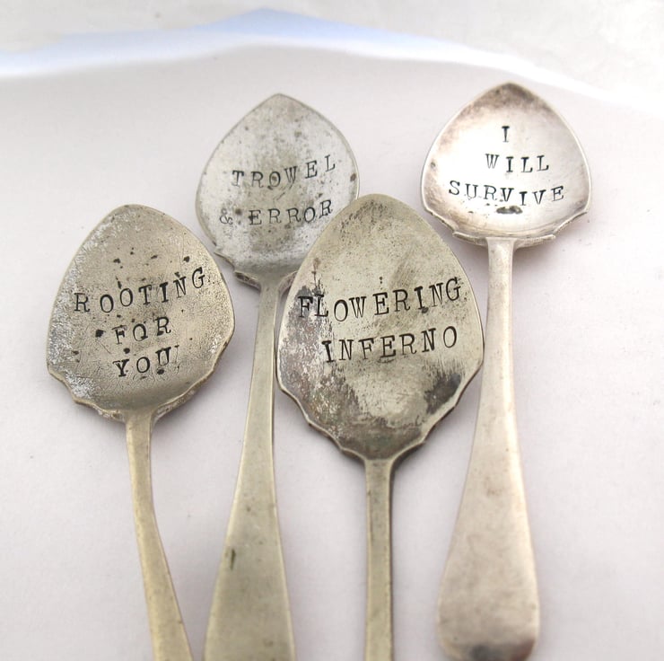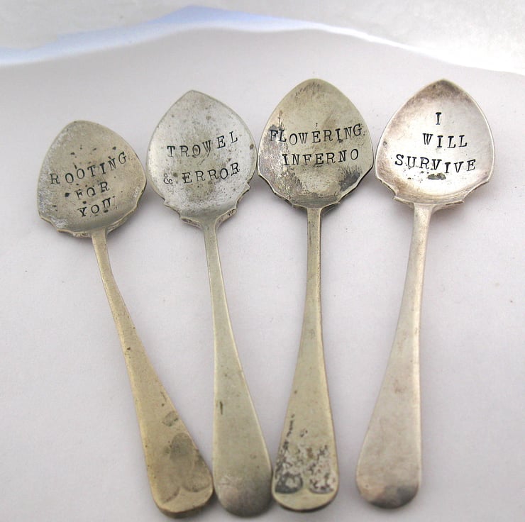 Set of four mismatched antique jam spoons upcycled into plant labels that read FLOWERING INFERNO, TROWEL & ERROR, ROOTING FOR YOU and I WILL SURVIVE. So whether you are optimistic or pessimistic about their respective futures, you'll be able to tell your seedlings apart!