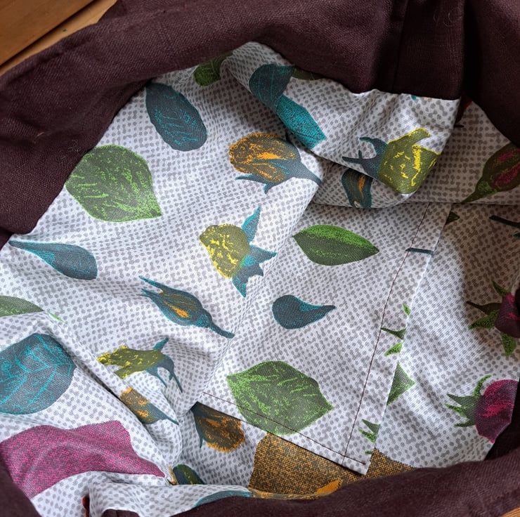 Deep brown pure linen with a digital print cotton lining - this bag is calm and sophisticated on the outside while having a party on the inside. A round slouchy shape with feminine pleats, wide handles and an interior pocket. Approximately 57cm across at its widest and 47cm high (not counting handles). The perfect everyday bag,