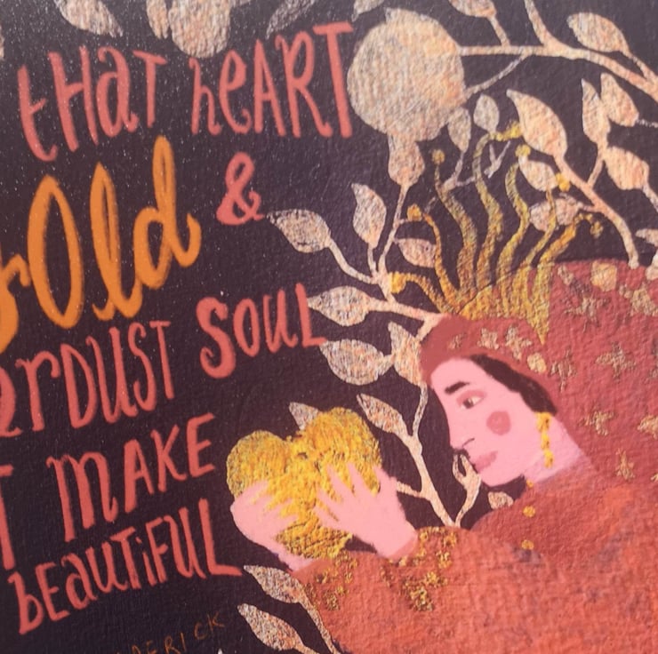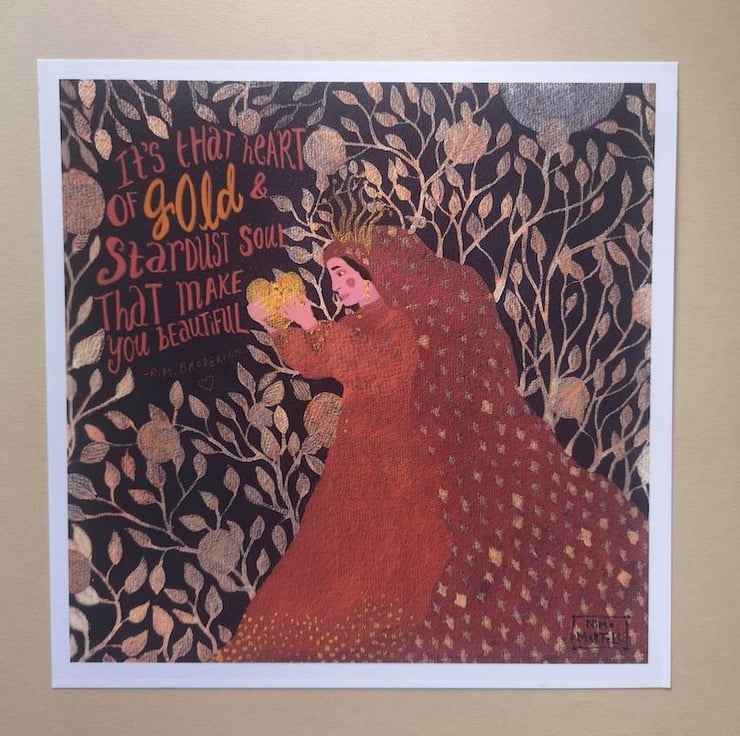 This is a print of my illustration Heart Of Gold. A portrait of a mystical woman adorned with a golden head dress. The quote " It's that heart of gold & stardust soul that make you beautiful". by R.M Broderick.