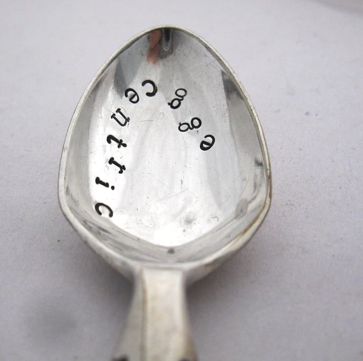 An antique Victorian egg spoon in a traditional 'fiddle pattern' style, with the truly terrible pun 'eggcentric' hand stamped in non-linear black lower case lettering in the bowl. Would make a nice little Easter gift for anyone who is a bit out of the ordinary and has a sense of humour!