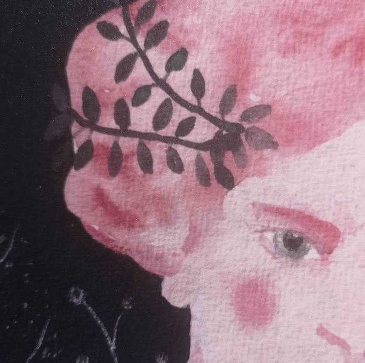I love to imagine people. Here I created this woman with pink hair and floral headdress. She has pink hair and there is something very gentle about her and vulnerable . She has a Grecian look about her.