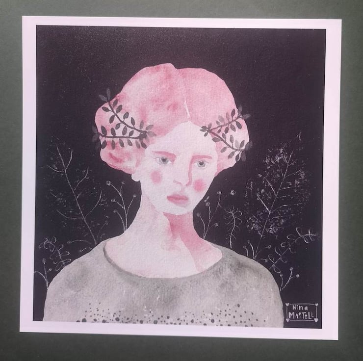 This is a print of Grace. A portrait of an imaginary woman with pink hair and a headless made from leaves. She has a Grecian feel about her. She is rather evocative and is deep in thought.