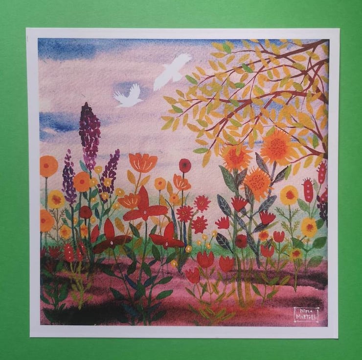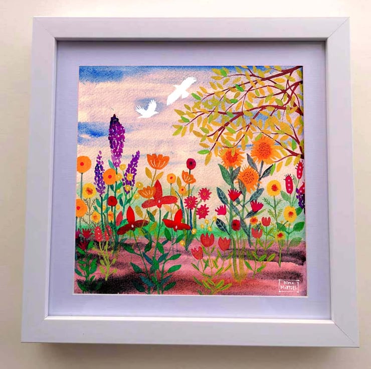 This is a print of my artwork called 'Peace'. A floral garden with white birds flying above. I wanted to create an artwork evoking the feeling of peace within nature.