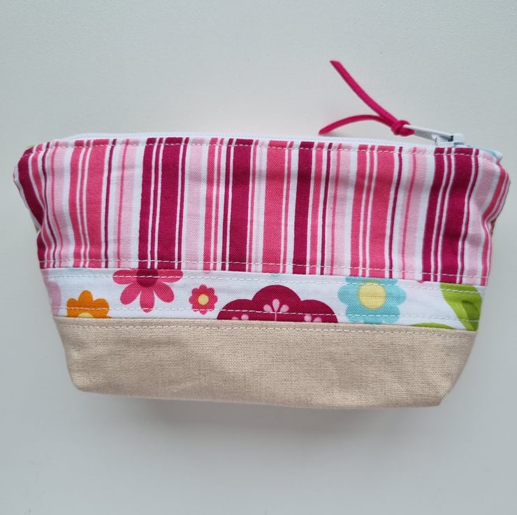 Made from 100% cotton and linen, fully lined with white zip and pink vegan suede pull, with a box bottom.