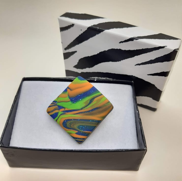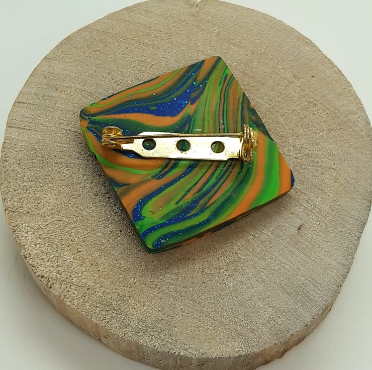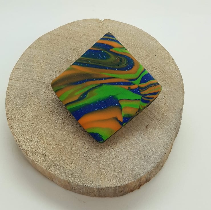Handmade square multi coloured brooch using a blend of orange, blue and lime green polymer clay to create a unique swirl design with a hint of sparkle