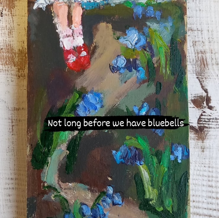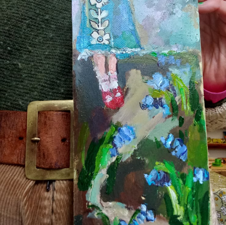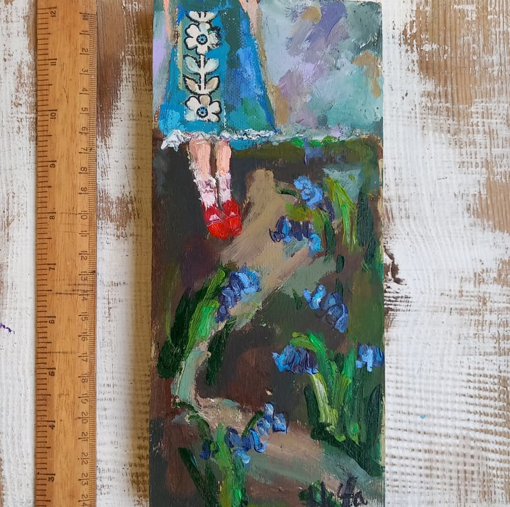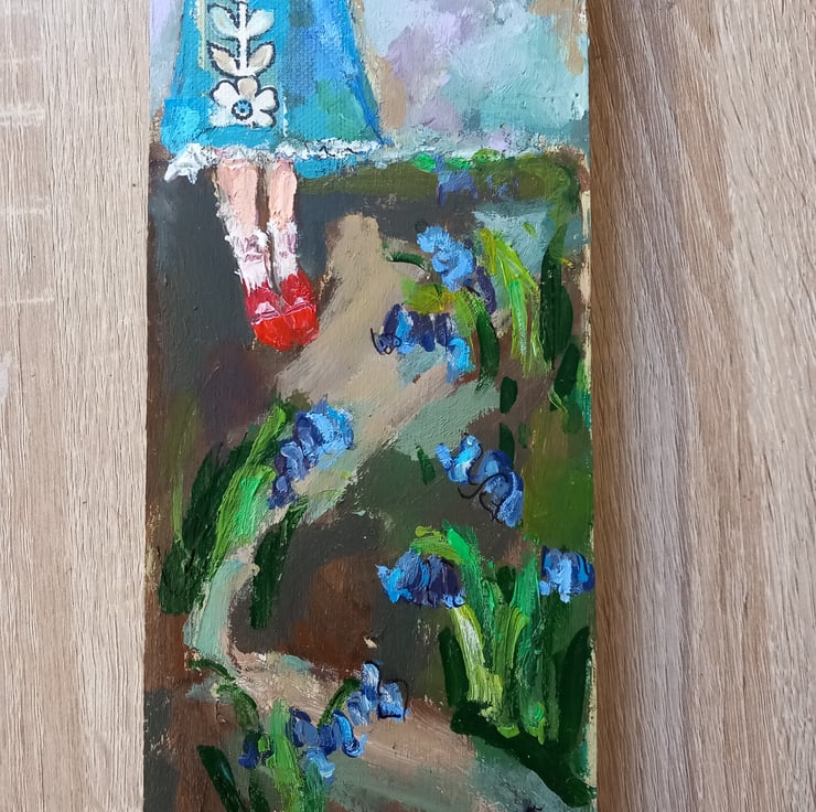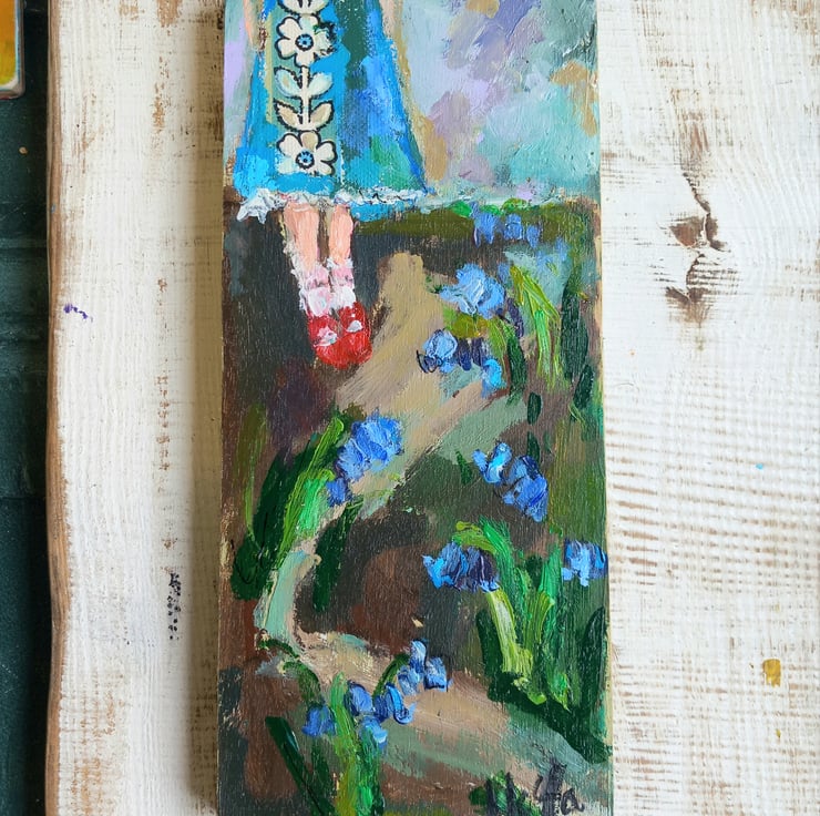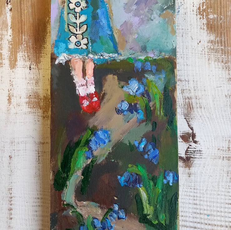 She put on her best red shoes on to go for a walk and celebrate the first of the bluebells. A small, sweet painting on reclaimed wood. It is mixed media as i have used some collage on her dress.