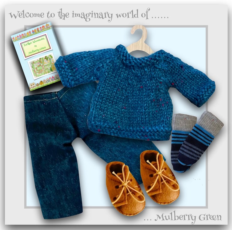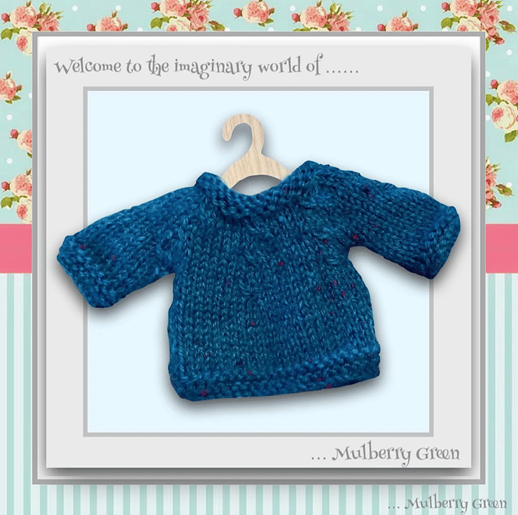 A lovely petrol blue tweed jumper, to fit the Mulberry Green characters. The jumper is hand knitted and looks lovely with the jeans or corduroy trousers in my shop.
