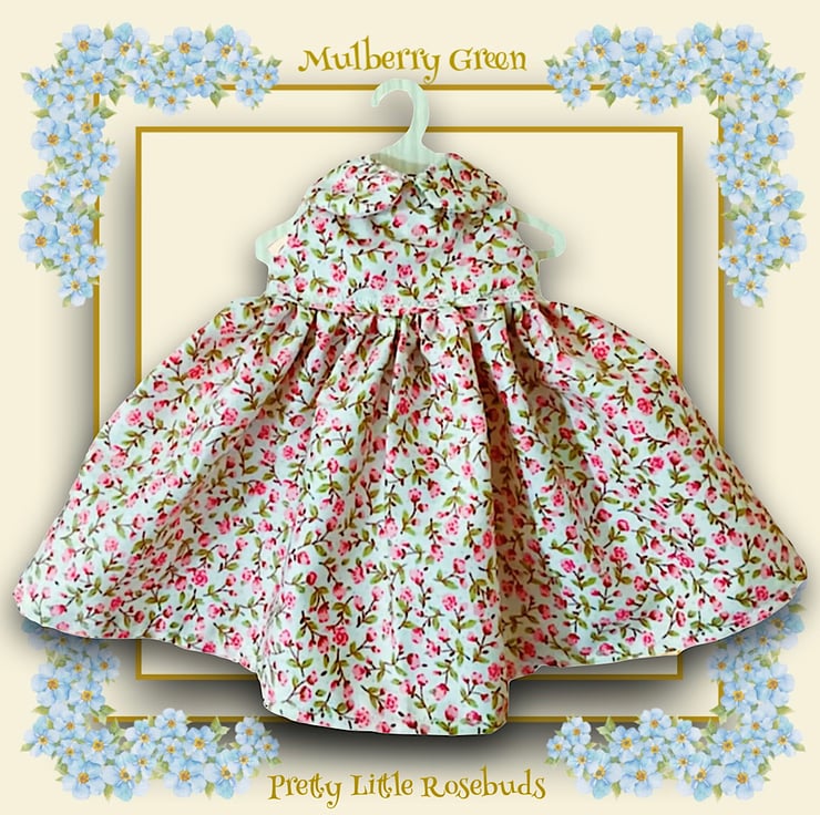 A lovely little dress in a pink buds print to fit the Mulberry Green characters. The dress is made from cotton, has a Peter Pan collar and a lined bodice.