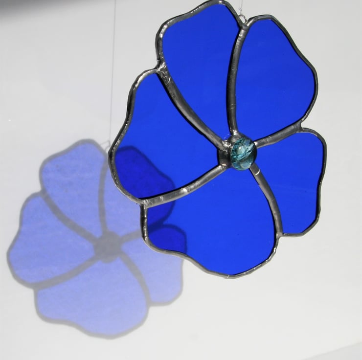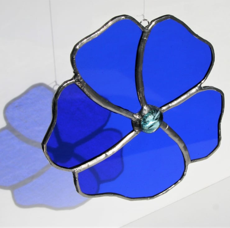 This rich blue stained glass flower will look stunning hanging at a sunny window. It can easily be attached to a hook or simply a window sucker. It would make the perfect gift for an anniversary or birthday as it is unique as no two pieces of glass are the same.