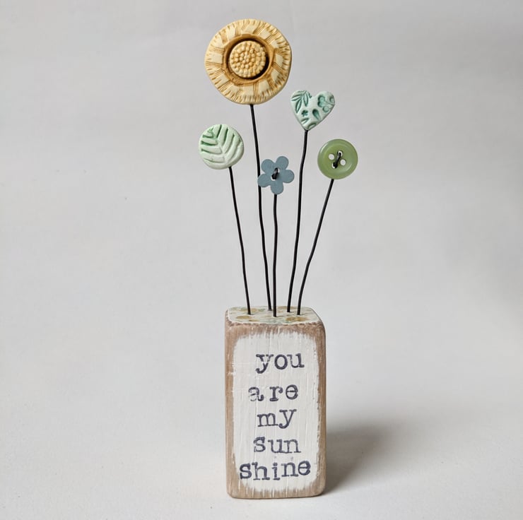 The clay sun is made from polymer clay. This is hand moulded and patterned, fired and painted to finish. A little clay heart, leaf and button flowers stand beside it.