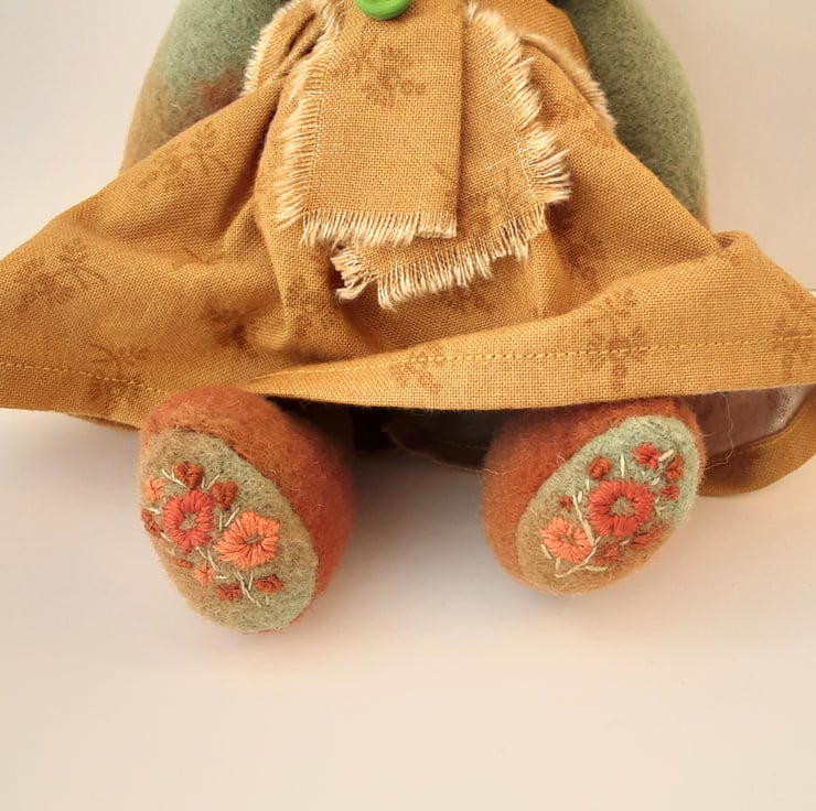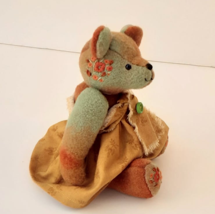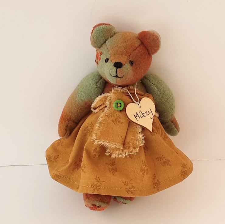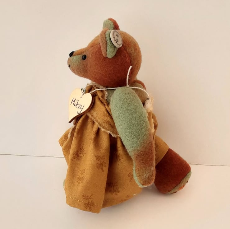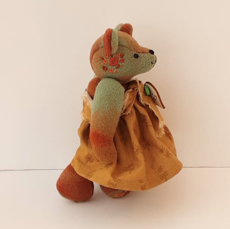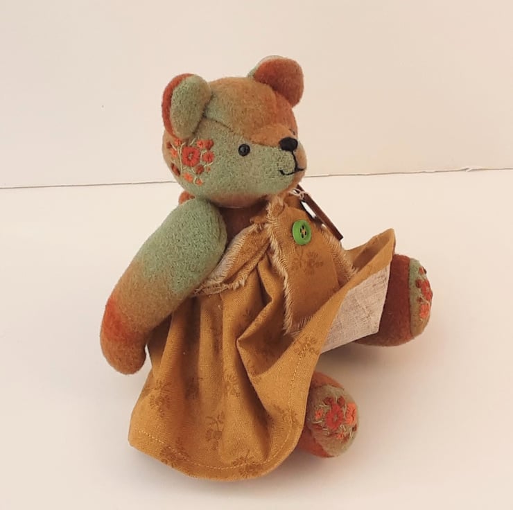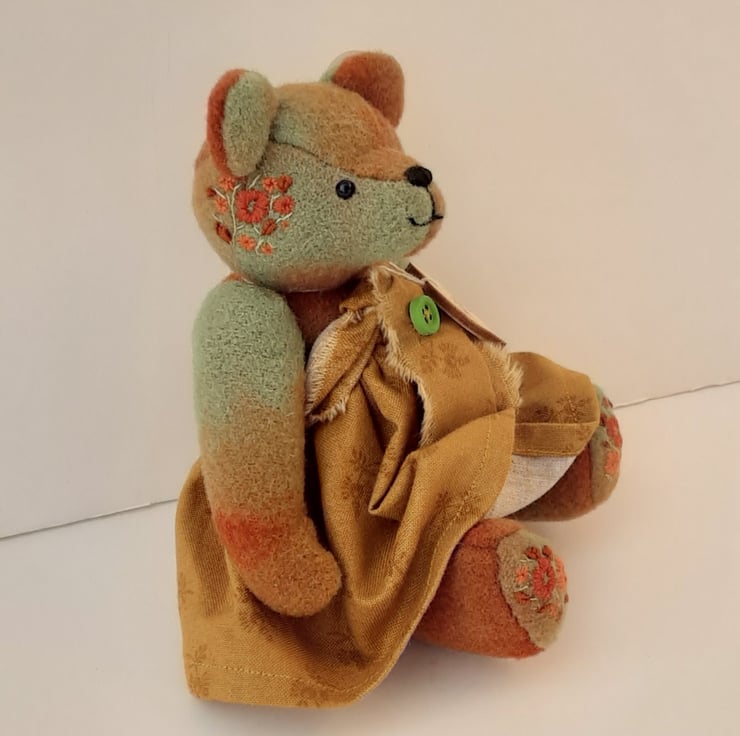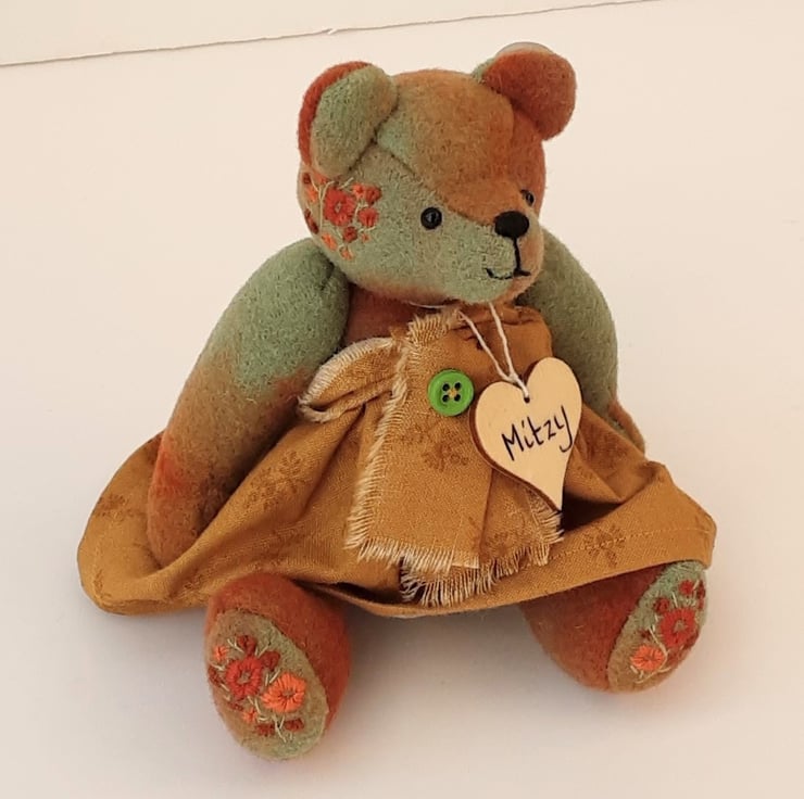 Meet Mitzy, a cute little bear handmade from hand dyed wool fabric in burnt Sienna, cinnamon and savanna greens, beautiful rich colours and an unusual, unique fabric.