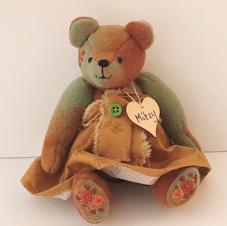 Mitzy is a cute, playful bear, a completely unique character and only one of 2 mini bears made from hand dyed fabrics with hand embroidery.