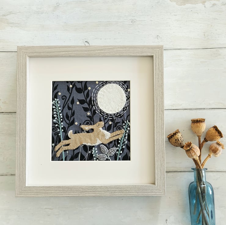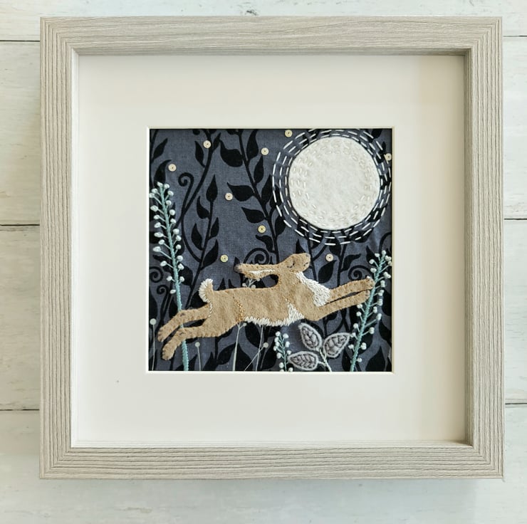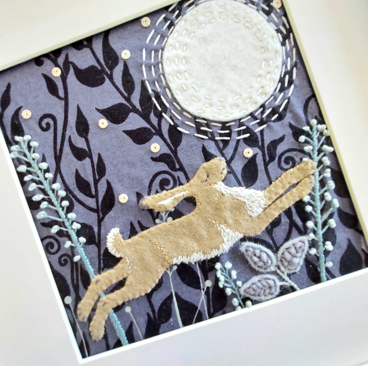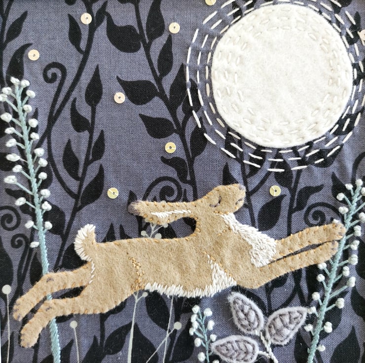 Beautiful moongazing hare leaping through a midnight landscape picture carefully embellished with hand embroidery.