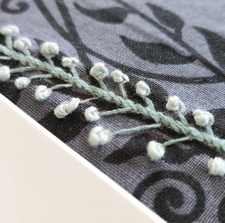 Printed cotton background with applique hare, moon and fauna enhanced with hand embroidered stitches finished with tiny sequin stars.
