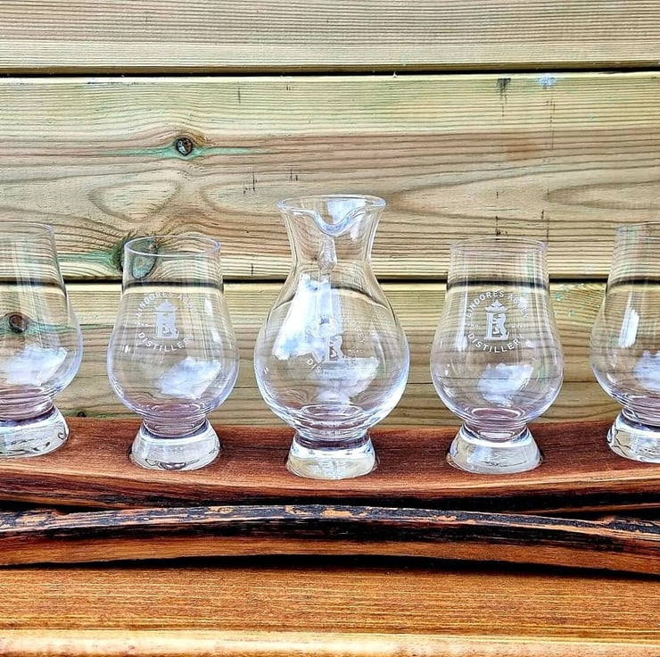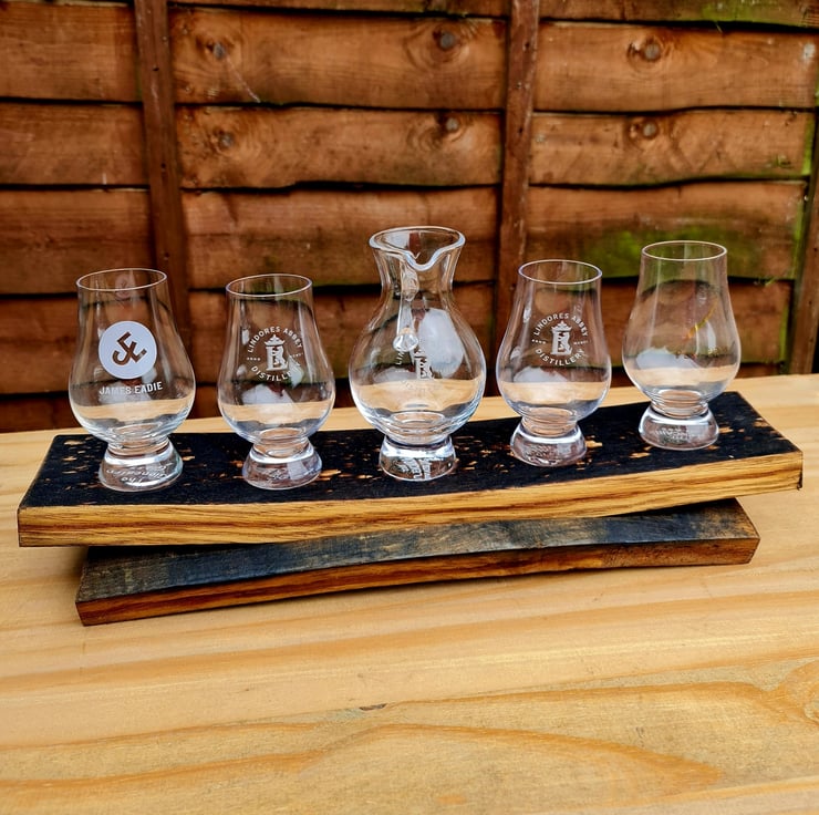 Stunning and unusual handmade whisky barrel stave flight tray perfect for your Glencairns and matching jug (Not included), A fabulous way to display your favourite glasses and whisky.