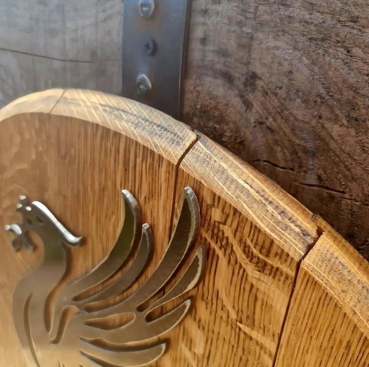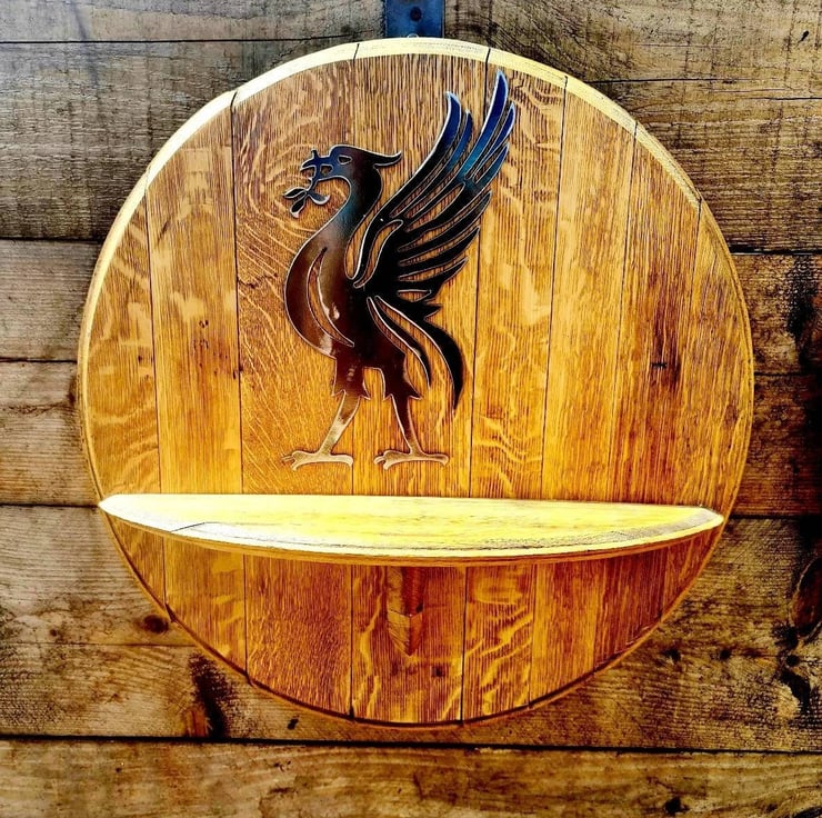 This stunning shelf is handcrafted using retired whisky barrel lids. It is solid oak and fully reinforced to ensure structural integrity. The hanging bracket is made using steel barrel hoops nothing is wasted!