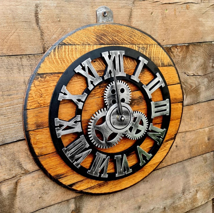 This fabulous clock is made from an upcycled oak whisky barrel lid it has a hanging bracket made using a barrel hoop approx 22/24" wide
