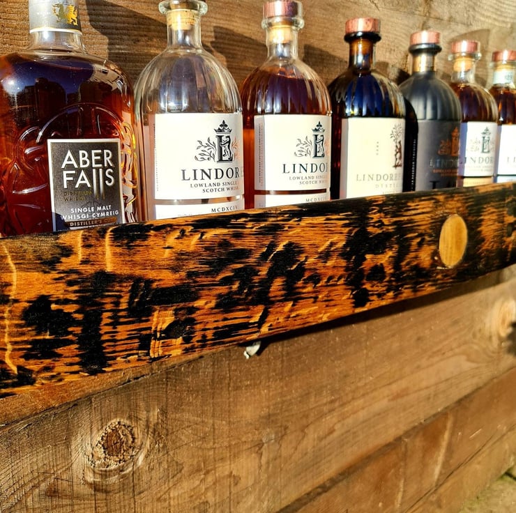 This fabulous bottle shelf is made using upcycled oak whisky barrel staves with the bung hole in the front to give it that extra wow factor.. perfect for storing your favourite bottles of Whisky/Spirits