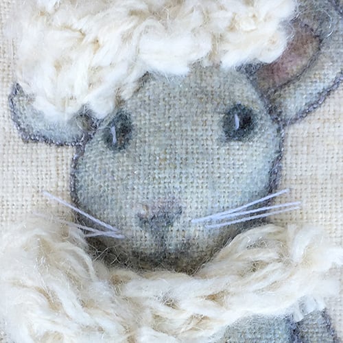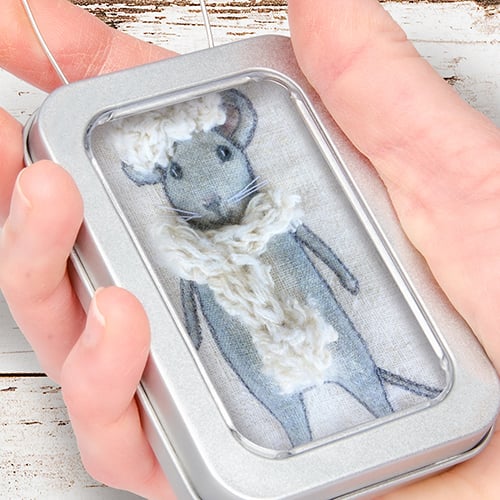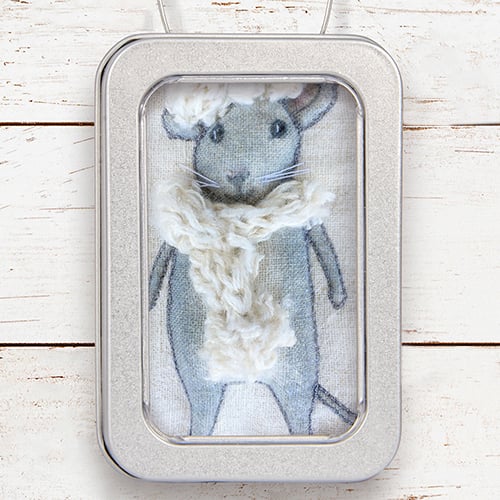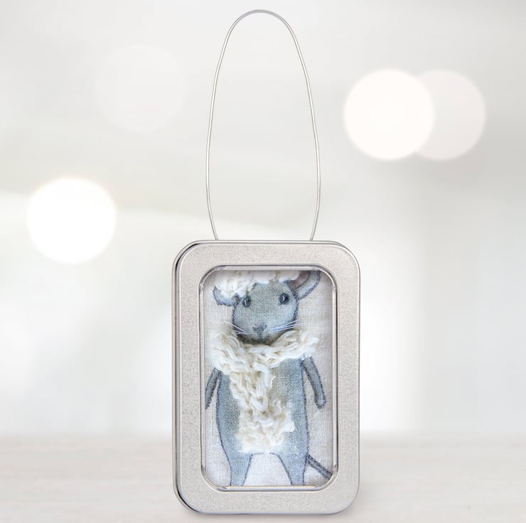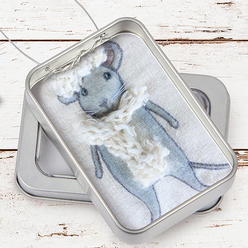 Winter mouse, hand embellished, textile print - stitched and framed in a tin, with a loop to hang it up